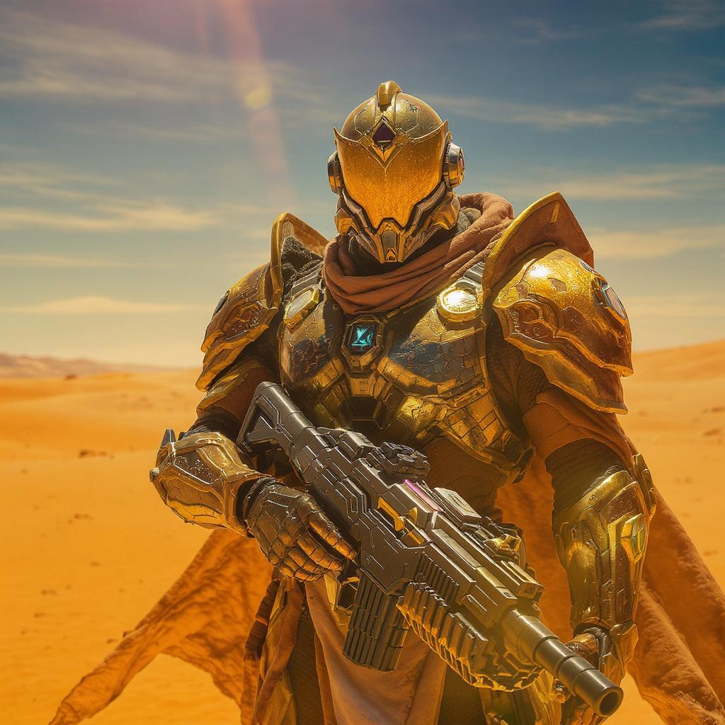 A lone peacekeeper in a futuristic post-apocalyptic desert landscape, wearing intricately forged armor that blends ancient designs with cutting-edge technology. The wide-open desert stretches infinitely under a blistering sun, casting long shadows. This security force member stands vigilant, an imposing figure armed with an advanced energy rifle that hums with latent power. The scene is captured in a cinematic, high-definition, HDR quality, enhancing the vibrant hues of the desert and the reflective surfaces of the armor, giving the impression of an 8K visual masterpiece. The peacekeeper's gaze is unwavering, embodying resilience and order in a chaotic world.