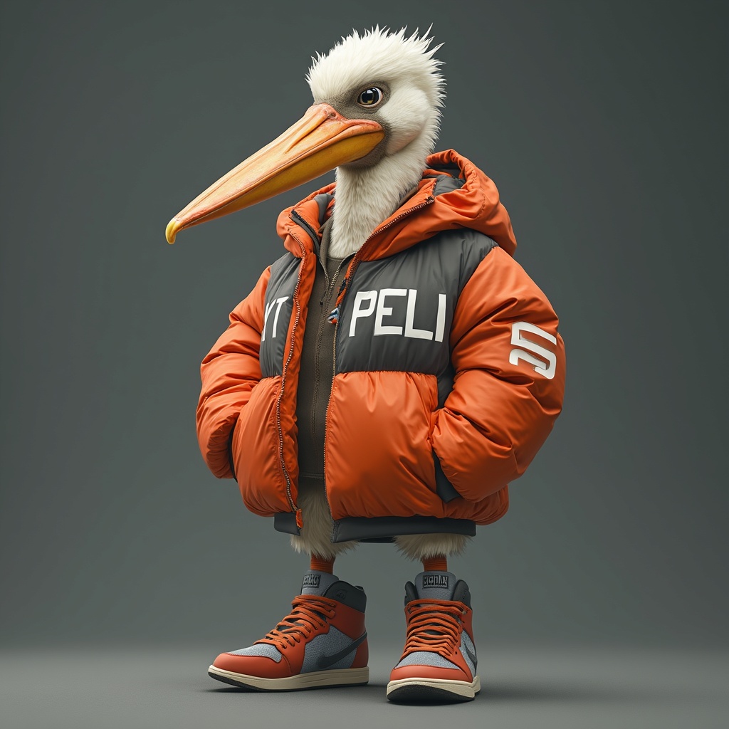 View this AI-generated image featuring a whimsical pelican dressed in a vibrant oversized puffy jacket and sleek nike air jordan inspired sneakers the word peli emblazoned on its attire in bold white letters the bird stands confidently against a moody charcoal gray background exuding a playful yet s