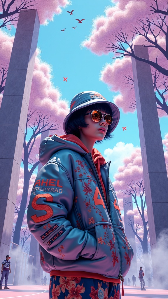View this AI-generated image featuring in a tok inspired photo editorial a dynamic action pose captures a figure wearing mirrored lenses and a creatively designed bucket hat standing against the vibrant backdrop of tokyo large marble structures and ethereal white purple trees frame a basketball cour