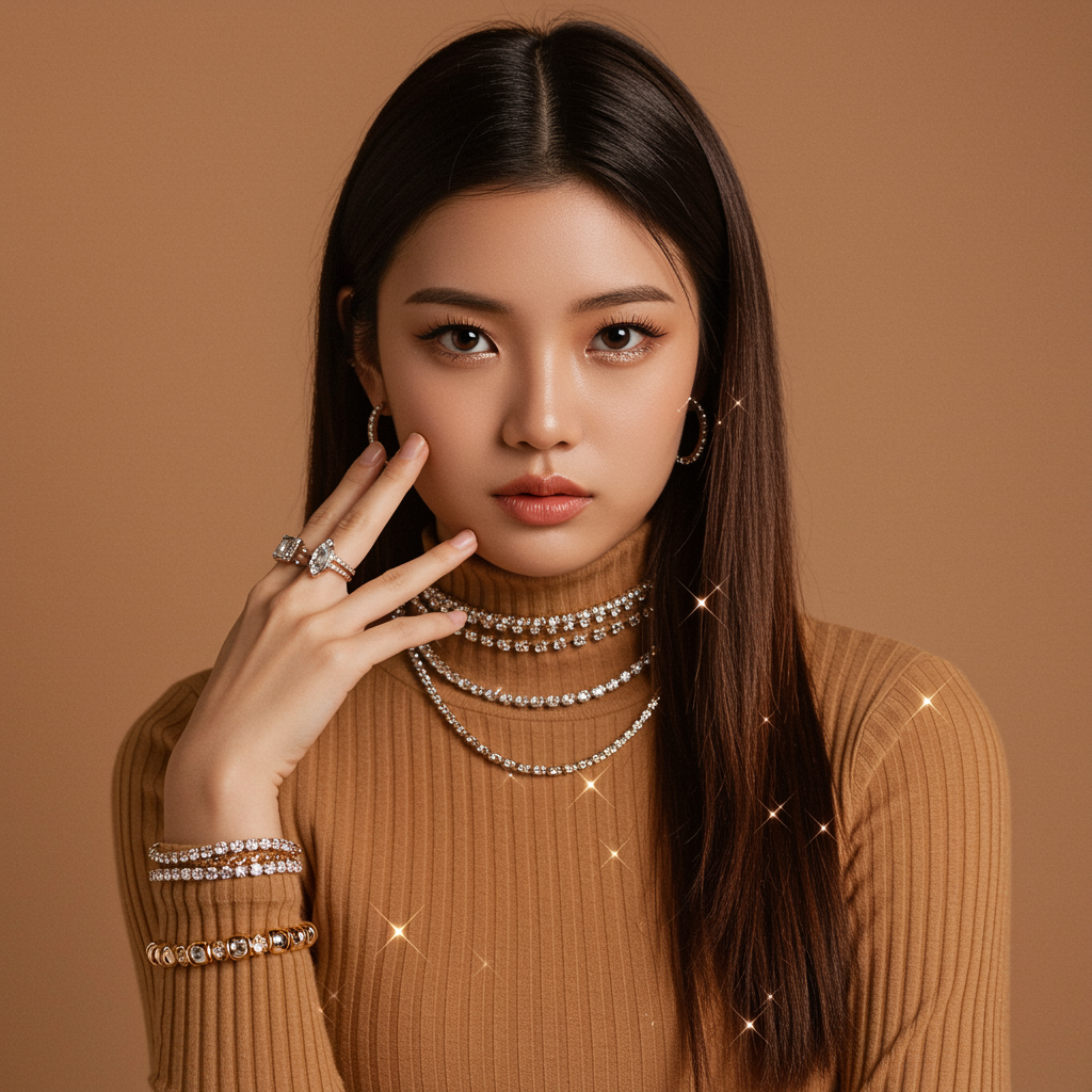 View this AI-generated image featuring a commercial photo portrait of a young instagram model embodying sparklecore aesthetics and appropriation art featuring shiny and glossy elements with clear edge definition the model showcases unique and one of a kind pieces in a palette of light brown and ligh