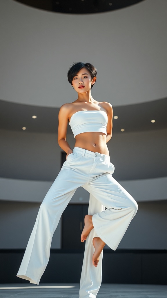 Photo of a slender young Asian female supermodel with a flat chest and toned abs, featuring short tousled black hair. She is wearing a pristine white, collarless tunic cropped at the midriff and modern tapered trousers. Playfully kicking one leg up behind her, she is positioned according to the rule of thirds. The background showcases a Bauhaus-inspired theater stage, with minimalist lighting mimicking a starry night sky. The model is bathed in gentle natural lighting.