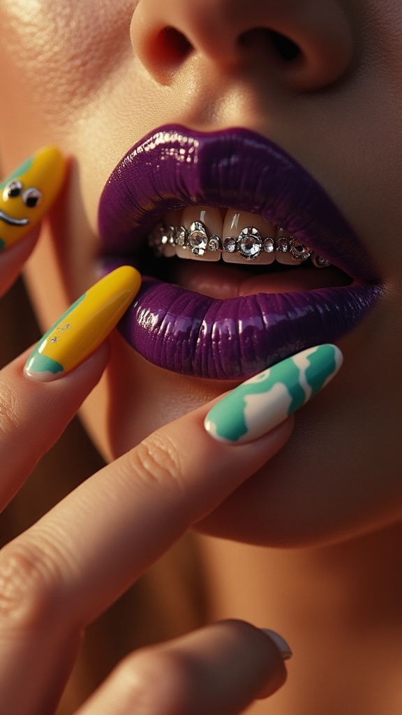 A close-up photograph captures glossy deep purple lips, slightly parted to reveal teeth adorned with sleek, platinum grillz. The lips shimmer with a high-shine, wet-look gloss, reflecting light in a dramatic, cinematic fashion. Long, vibrant acrylic nails with an abstract pattern of teal, turquoise, and white gently touch the lips. One nail features a playful smiley face charm in vivid yellow, surrounded by tiny, sparkling rhinestones. The scene is illuminated with warm, golden lighting that casts soft, moody shadows, adding a touch of high-fashion drama. The image is characterized by a grainy texture evocative of vintage 35mm film, with a high contrast and shallow depth of field that draws focus to the intricate details, reminiscent of editorial photography captured through a macro lens.