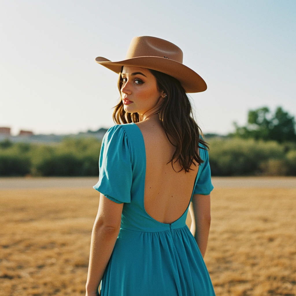 A 35mm photograph capturing a woman in a vivid blue dress and a stylish cowboy hat, exuding a blend of modern charm and nostalgic flair. Her back is gracefully exposed, capturing the carefree spirit inspired by Rex Orange County's melodies. The color palette is a striking combination of cyan and orange, reminiscent of sunlit skies and warm, Texas afternoons. There's a cinematic touch in her resemblance to Ana de Armas, effortlessly bridging glamour and authenticity. The artwork takes cues from the expressive strokes found in works by Maxwell Boas and Jenny Saville. Set under the radiant Texas sun, the portrait brims with summer vibrance, evocative of the year 2020's golden hue. Its grainy texture hints at analog nostalgia, while azure and red tones subtly thread through, offering a nod to a possible San Francisco backdrop. The image, with an f/2 aperture, blurs surreal emotion with artful composition, capturing a fleeting yet timeless moment.