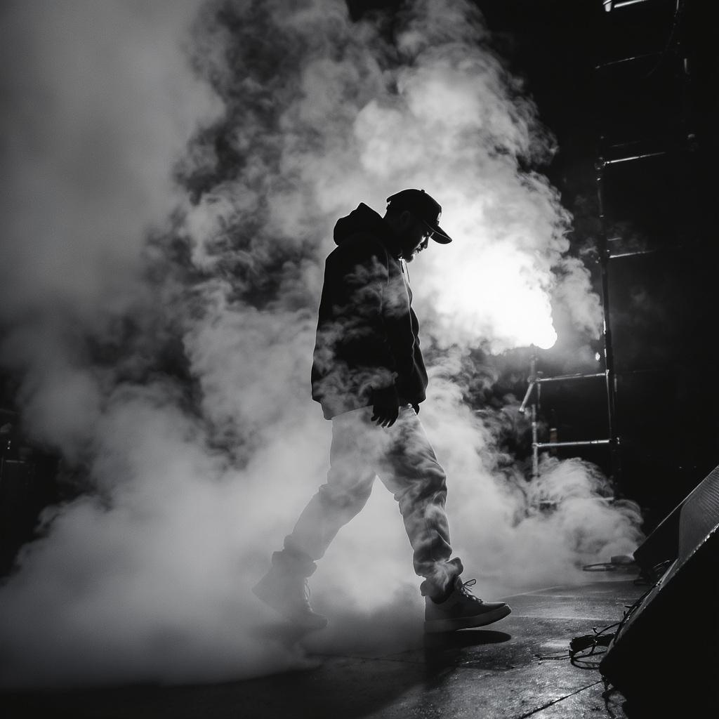 A monochrome photograph capturing a rapper in a baseball cap stepping through swirling mist on stage during an electrifying concert, viewed from the side with dynamic, dramatic lighting creating a moody, cinematic atmosphere, highlighting the contours and energy of the performance.