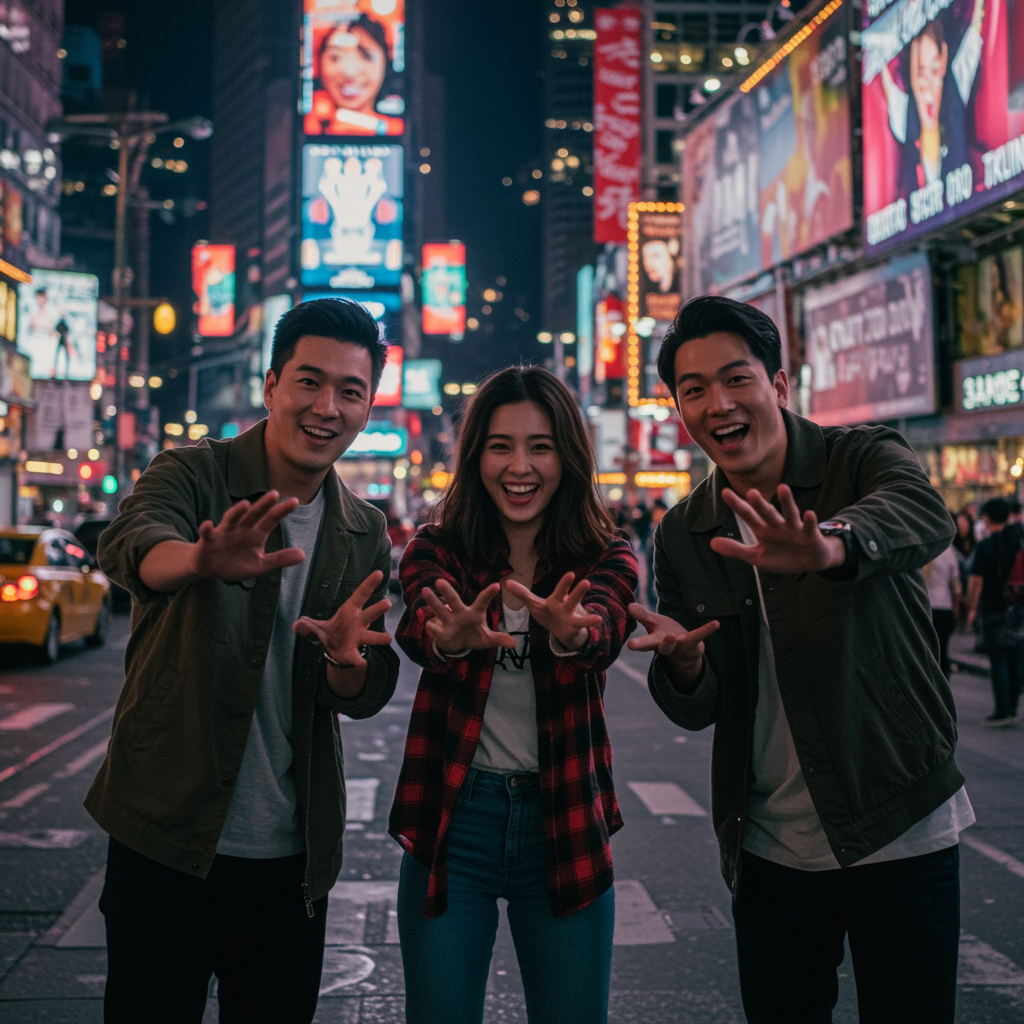 View this AI-generated image featuring a cinematic photograph of three friends standing on a bustling city street their hands playfully reaching toward the camera expressing joy and spontaneity as vibrant billboards light up the scene around them. Created using advanced AI technology, this image sho