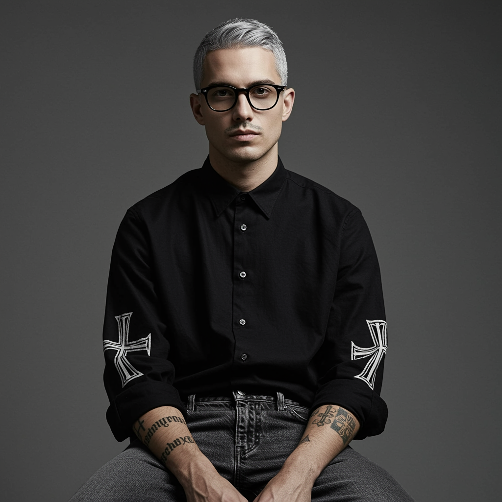 View this AI-generated image featuring photograph long range shot fashion model male seated on a chair hairstyle is silver undercut wearing black horn rimmed glasses clean shaven face his attire consists of a black loose fit shirt with rolled up sleeves revealing a medium gothic design cross and let