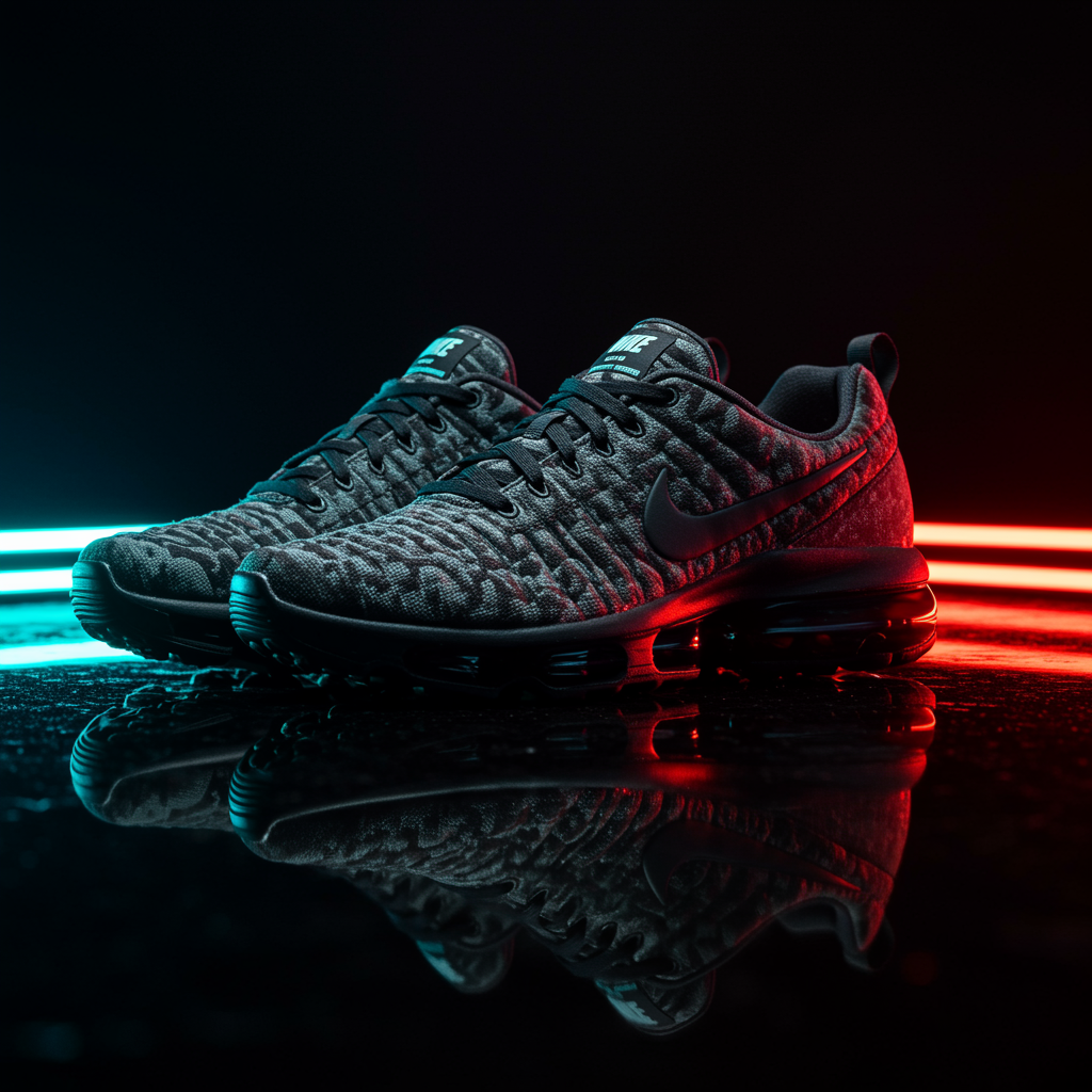 A captivating photograph of Nike shoes adorned with a sleek camouflage pattern, set against a glossy black backdrop that creates a spectacular reflection. Neon accents add vibrancy to the scene, enhancing the productive energy and futuristic vibe of the composition.
