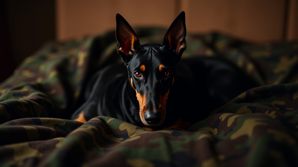 A minimalist photography studio captures a striking scene, focusing on the intricate details of a camouflage pattern blanket draped over a dark camouflage texture sofa. Nestled on the sofa is a black Doberman, its intense gaze meeting the camera head-on. The setting is bathed in the soft, dusky glow of sunlight, casting realistic highlights across the scene. The photograph is in ultra-high definition resolution, emphasizing the depth of field and rendering an ultra-realistic image that maintains a raw aesthetic. The overall ambiance blends the camouflage theme with subtle evening warmth.