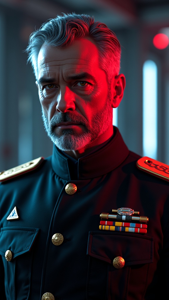 View this AI-generated image featuring photorealistic detailed portrait of a seasoned fleet admiral drawing inspiration from star wars star trek and warhammer 40k universes radiating authority and intensity the figure showcases a british officer s aura combined with the commanding presence of admira