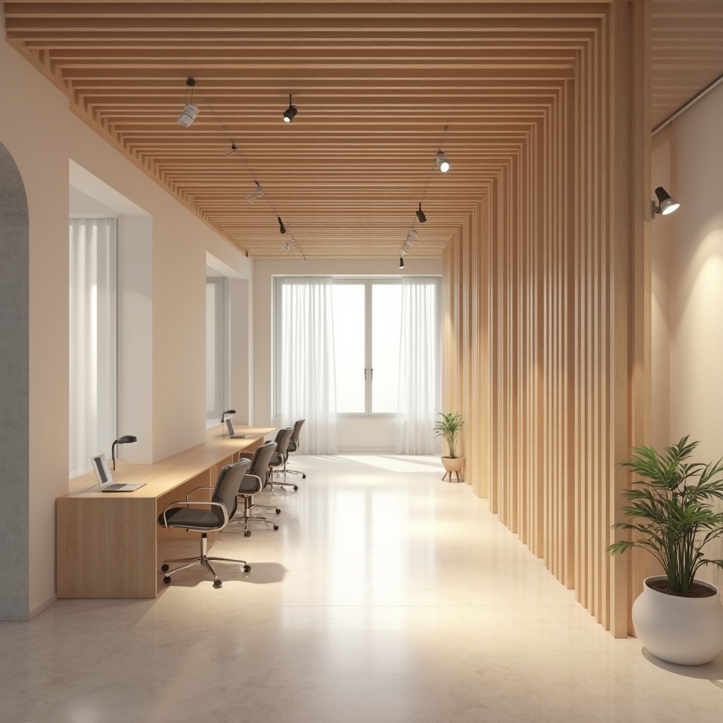 View this AI-generated image featuring photorealistic perspective view of a minimalist co working space showcasing a bright and ambient atmosphere with intricate vertical horizontal design elements minimalist lighting featuring 4500k indirect light and sleek spotlights integrated into the ceiling pr