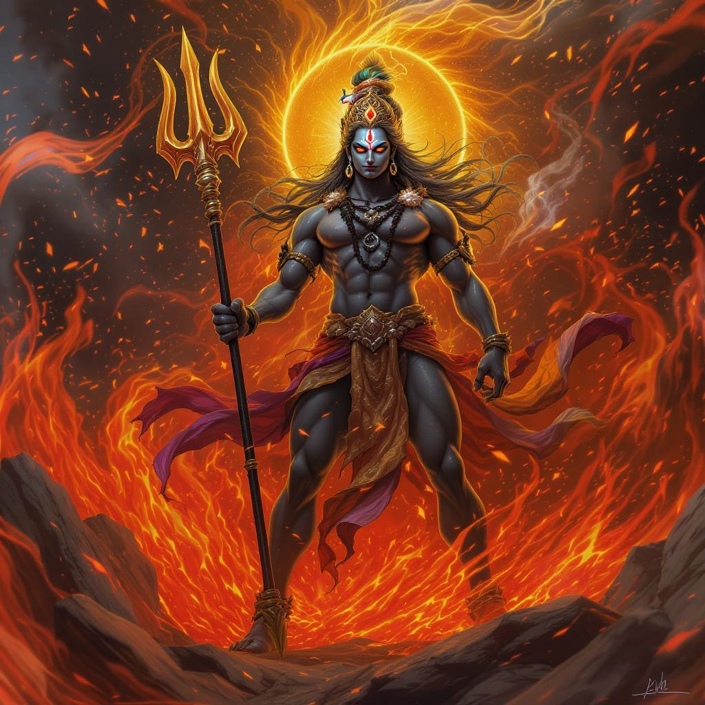 A One Piece-inspired character resembling Lord Shiva from Indian mythology, featuring a perfectly symmetric body and wielding a majestic trishula. Crafted in exquisite detail, the character stands against a backdrop of vibrant, roaring flames. Displayed in a full-body cinematic pose, enhanced by dramatic lighting and high contrast, the scene captures the essence of divinity and power. The artwork, designed for ArtStation, showcases an intricate character concept in stunning 8K resolution, balancing creativity with core mythical elements.
