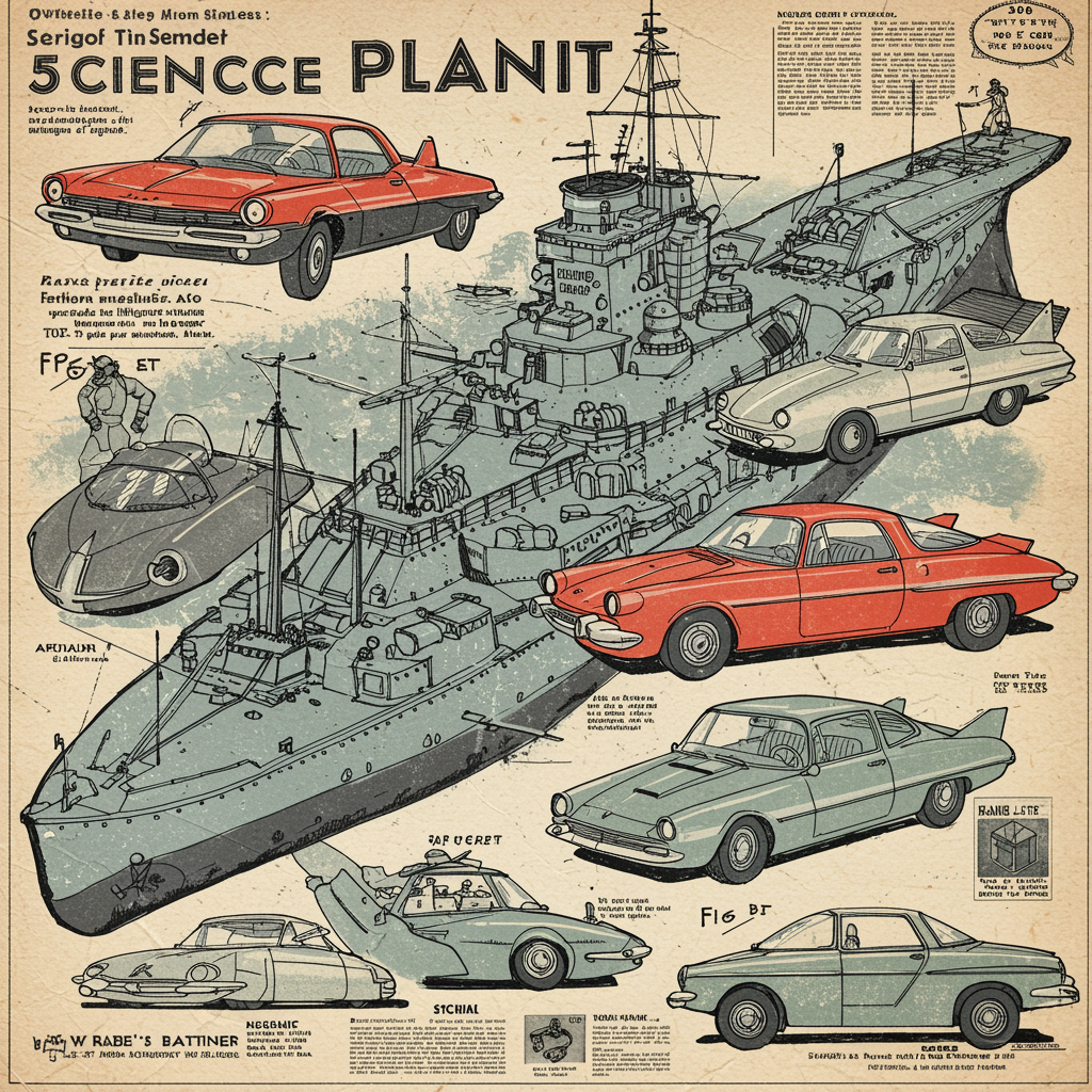 PlanIt, intricately detailed infographic of retrofuturism cars featured in vintage science and design magazines | 1960s nostalgia | elaborate craftsmanship | digital art | concept painting | poster design | prize-winning | ultra detail, hdr quality, scientific and technical illustration, imaginative render, architectural blueprints, schematic drawing, patent-style diagram, symmetrical artistry, nautical battleship influence.