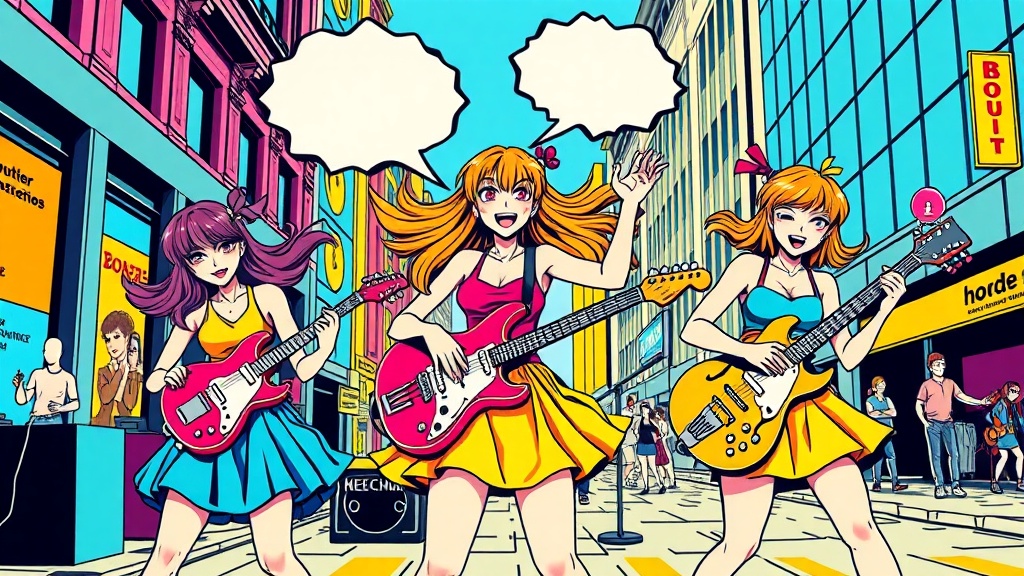 View this AI-generated image featuring a vibrant pop art scene featuring three girls energetically playing music on the street their colorful instruments contrasting against a lively urban backdrop the girls each with dynamic expressions and bold graphic attire are surrounded by attention grabbing s