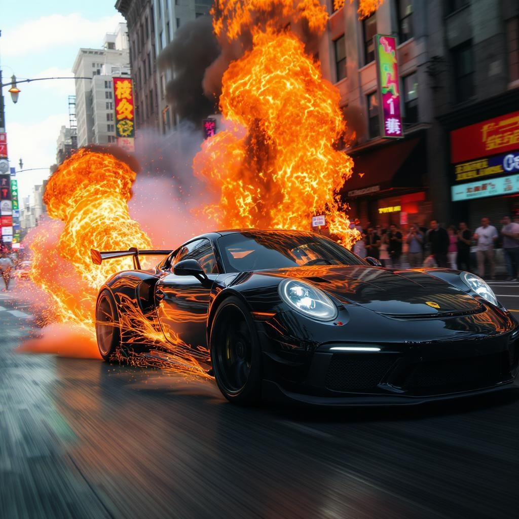 View this AI-generated image featuring a sleek porsche hurtles through a crowded city street expertly navigated by action star dustin nguyen flames roar behind it engulfing a towering building in the background amidst a fiery spectacle the intense scene captures an adrenaline fueled moment blending