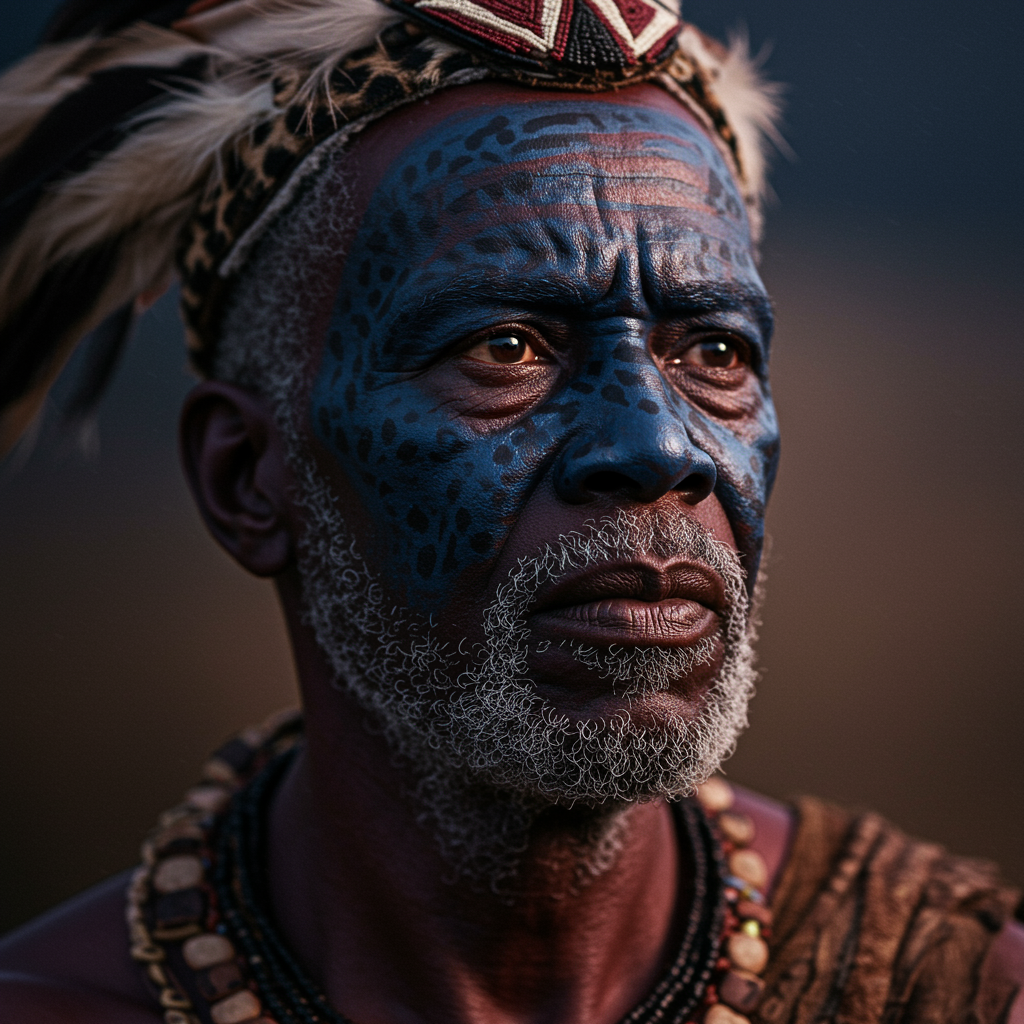 View this AI-generated image featuring portrait of an elderly african warrior chief with tribal leopard inspired makeup blending dark blue patterns over a deep crimson base he gazes off into the distance with intense wise eyes the scene is rendered in hyper realistic detail with cinematic lighting c