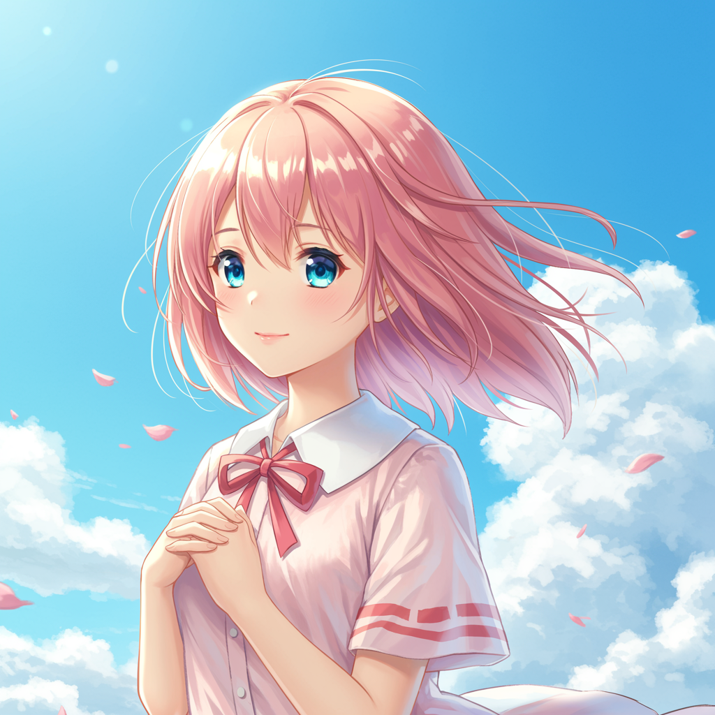 View this AI-generated image featuring a serene portrait of a girl in delicate attire reminiscent of oyari ashito s style set against a vast clear sky on a sunny day her gentle expression exudes innocence captured in a first person perspective using the highest quality manga and anime graphics the c
