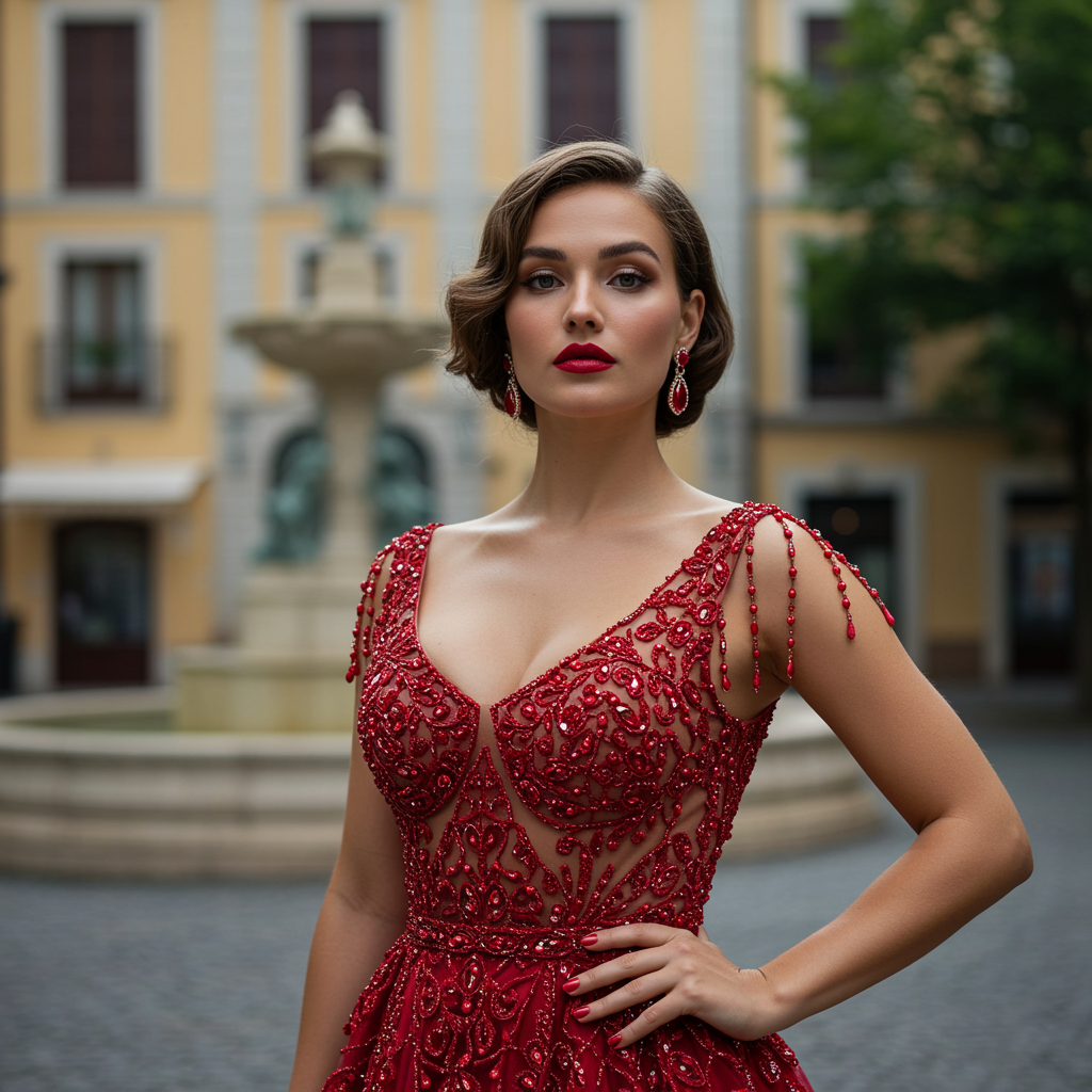 A stunning portrait captures a woman exuding elegance and confidence, her gaze fixed on the camera. She's adorned in exquisite haute couture, the fabric richly embellished with ruby beads that catch the light. The scene is set in a picturesque town square, with a charming fountain softly blurred in the distant background, evoking a sense of timeless beauty and sophistication. The image is inspired by the renowned Cass Bird, emphasizing glamour with a harmonious composition following the Golden Ratio. It's a photorealistic, hyperdetailed masterpiece, utilizing soft lighting and analog style to highlight her matte, detailed skin. The atmosphere conveys a sense of classic studio photography, captured with the high resolution and quality of an 8K UHD camera. The photo boasts a subtle film grain, reflecting the highest quality of art without any imperfections, presenting an impeccable portrayal of grace and style.