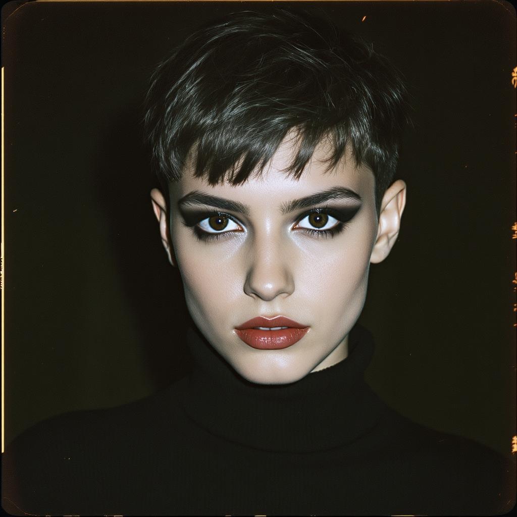 A striking portrait captures a young woman with an edgy haircut and mesmerizing eyes. The image, characterized by high contrast and dramatic lighting, accentuates her defined features with pronounced shadows and highlights. Taken with a vintage film camera and a fast prime lens, the photo exudes a gritty and raw texture. This compelling portrait, ideal for fashion editorials, advertising campaigns, or captivating art displays, retains an air of timeless sophistication.