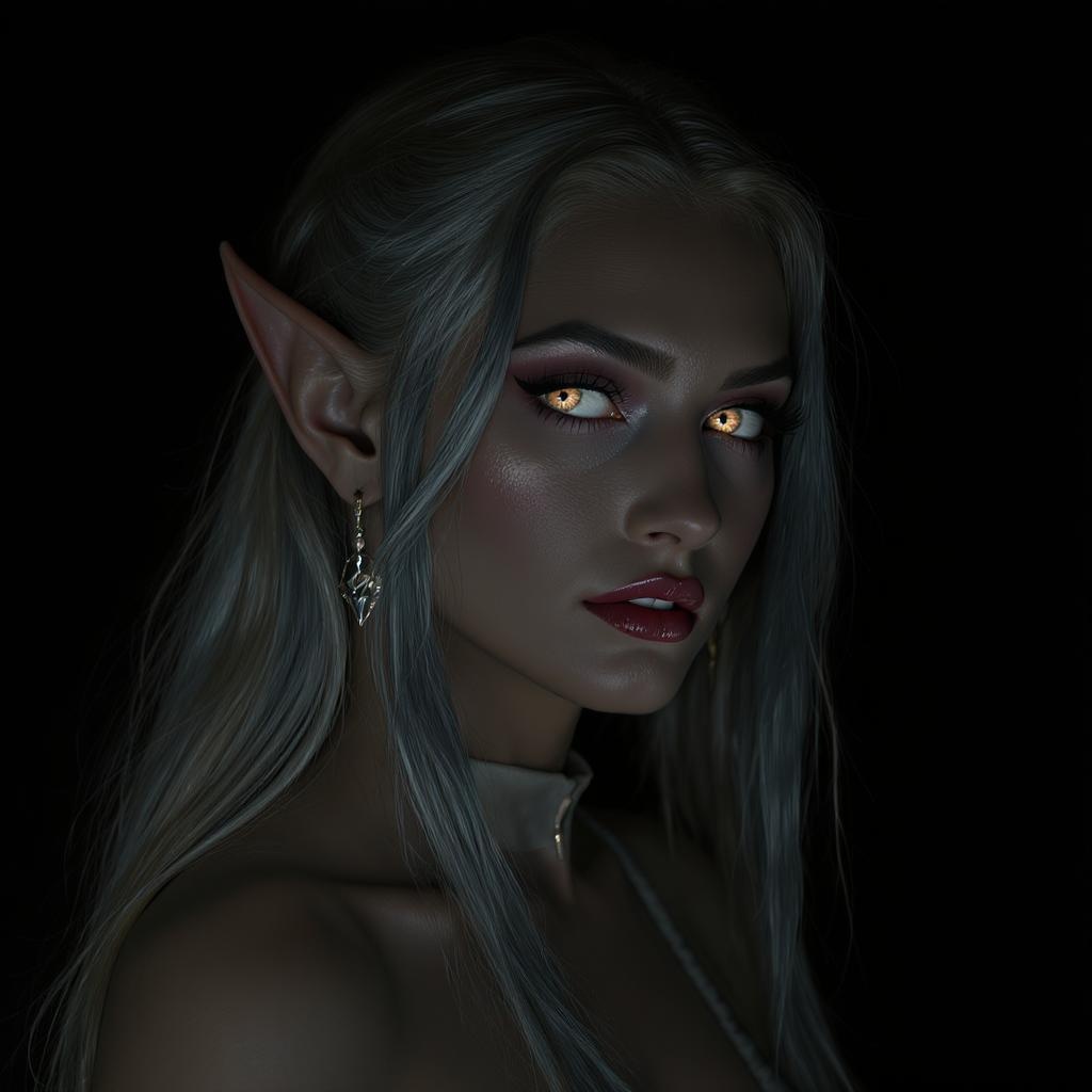 A stunning portrait of a captivating elven healer set against a pitch-black backdrop, showcasing mesmerizing, realistic eyes with perfect irises. Her delicate and alluring facial features exude femininity and a subtle, seductive charm. Inspired by the styles of David Kassan and Ismail Inceoglu, this artwork embraces a hypermaximalist approach with volumetric lighting, deep colors, and an award-winning level of detail. Captured in 8k, UHD, and HDR, the image avoids duplications or distortions, while maintaining clarity and precision without artifacts, watermarks, or unnecessary distractions.