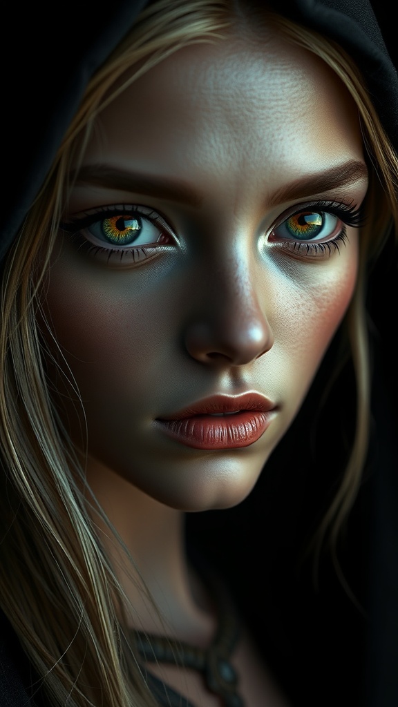 View this AI-generated image featuring a captivating portrait of a stunning elven healer set against a deep black backdrop featuring mesmerizing realistic eyes with perfect irises and enchanting facial features her allure and elegance are reminiscent of the works of david kassan and ismail inceoglu