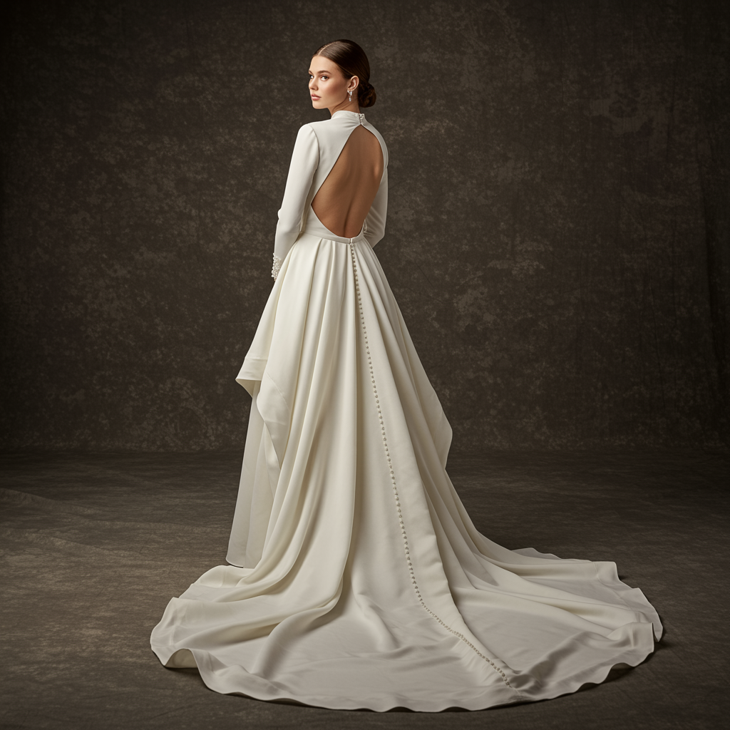 View this AI-generated image featuring a full length portrait of a woman in an elegant flowing ivory gown the gown boasts a modest high neckline and delicate long sleeves with a striking open back that adds a touch of allure the fabric cascades gracefully into an opulent floor length train crafted w