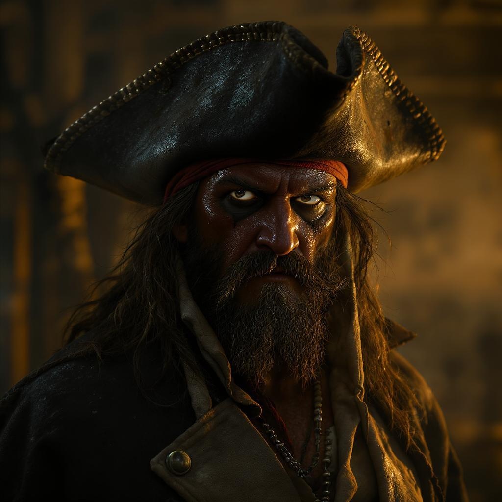 View this AI-generated image featuring a detailed portrait of a pirate half body shot with a menacing weathered face full of deep wrinkles carved from a life at sea emanating from his mouth and cheeks his dark oily hair hangs in a wild unkempt mass accentuating his fearsome demeanor he dons a distor