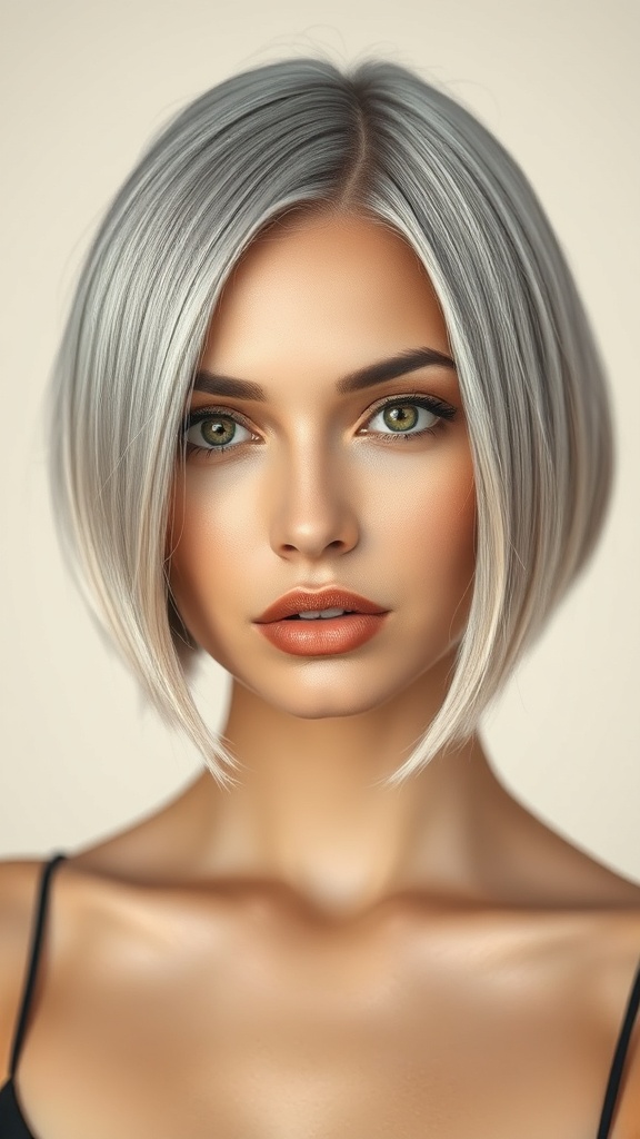 A striking portrait of a woman highlighting her sleek bob cut hairstyle in an elegant silver shade, set against a soft ivory background that accentuates the purity of the scene. The studio lighting is meticulously designed to reveal realistic details and softly highlight her natural hair texture, creating an exquisite high-fashion editorial feel. Her hair gleams with a subtle luster, capturing a sophisticated and contemporary essence.