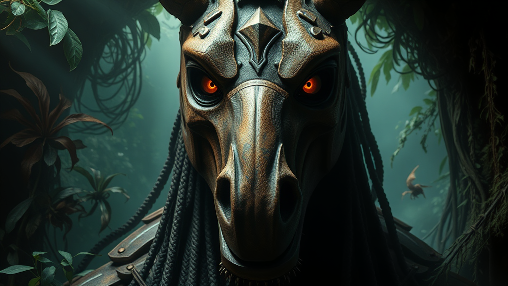 View this AI-generated image featuring a striking portrait of the horseman of the apocalypse hunger embodying a fusion of fog and metal aesthetics the detailed face is marked with sharp angular features and eyes that burn with an insatiable appetite surrounded by a lush overgrown environment where n