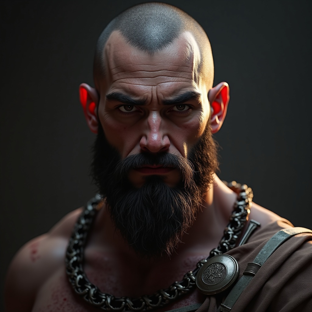 View this AI-generated image featuring portrait of a god of war intense gaze forward clean shaven with detailed facial features exhibiting a serious demeanor focusing on the upper body head and shoulders concept art in 8k resolution by dmc_kay and wlop showcases dynamic hyper detailed elements with