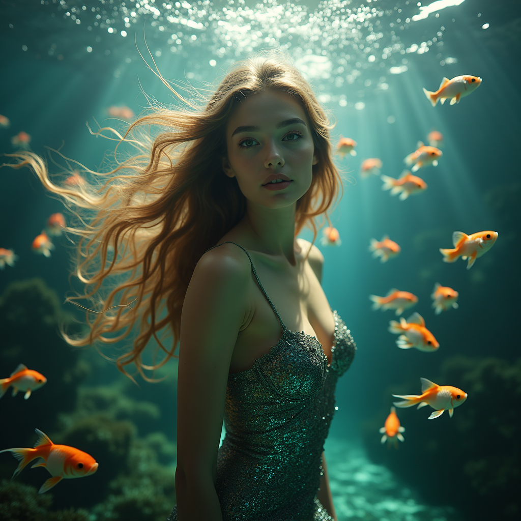A captivating portrait of a stunning mermaid with flowing, luxurious hair, surrounded by a swarm of shimmering goldfish set against a vibrant marine backdrop. Soft, filtered light gently pierces the water, casting an ethereal glow. The image is captured with cinematic flair, using a 35mm lens at F/2.8, enhanced by a subtle vignette effect and dramatic, spotlight-style lighting. The scene is incredibly detailed and intricate, exuding elegance and ornate beauty, rendered in 4k resolution, showcasing a masterfully detailed and elegant underwater world.