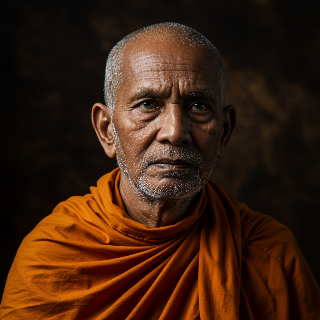 View this AI-generated image featuring portrait of a 58 year old monk gazing thoughtfully into the distance captured in cinematic style with 50mm lens precision featuring hard edge lighting that accentuates his contemplative expression dressed in traditional orange robes his serious eyes reflect wis