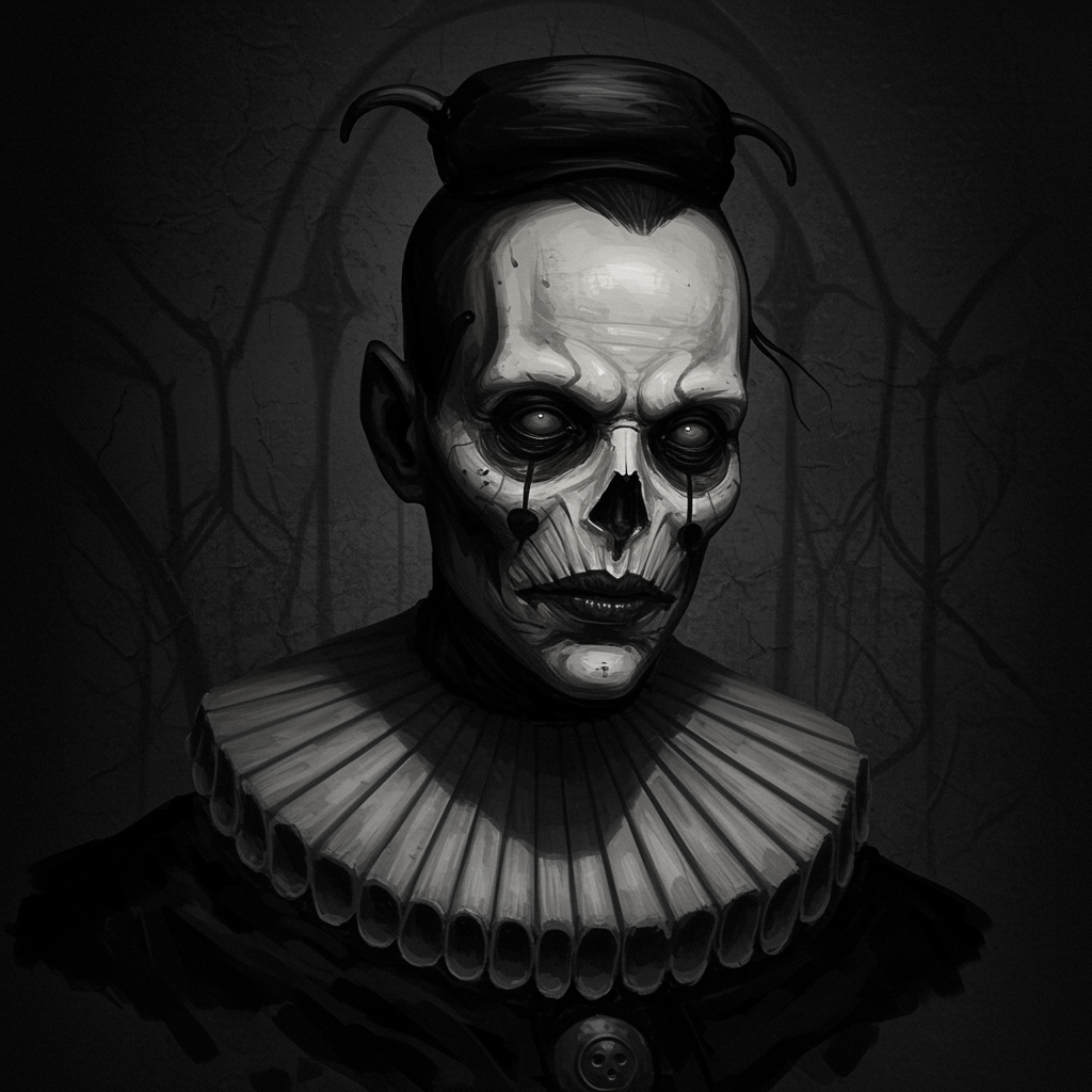 View this AI-generated image featuring a haunting portrait of a malevolent pierrot its malevolence palpable and chilling the gloomy atmosphere enhanced by the stark contrast of chiaroscuro with details so meticulous and intricate they challenge the boundaries of photorealism capturing the sinister e