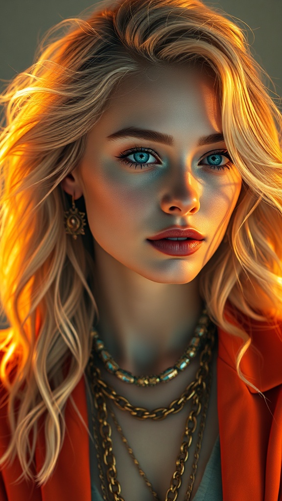 A captivating portrait of a blonde woman adorned in various outfits, blending dark aquamarine and light amber hues. This prismatic composition showcases a mashup of art styles, echoing the essence of whitcomb-girls and celebrity image fusions. Bathed in golden light, the image is rendered in exquisite 8k resolution with a raw, stylized approach, creating a dynamic and visually stunning masterpiece.