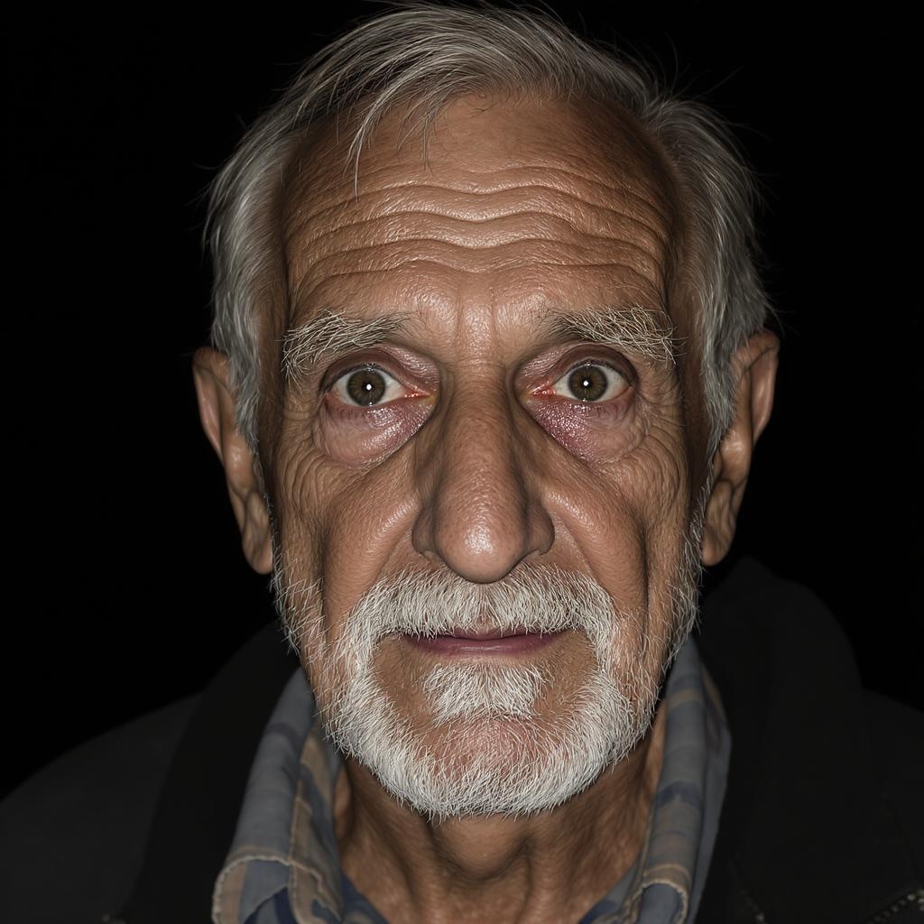 An image portraying a wise and weathered elderly man with deeply etched lines on his face against a dark, unobtrusive background. His eyes exude both fatigue and a profound understanding of life's complexities, speaking of countless experiences and lessons learned over time. The details are incredibly fine, capturing each wrinkle and grey strand of hair to convey the passage of years. His slightly furrowed brow and gentle, knowing smile suggest a sense of peace amidst life's challenges. The overall atmosphere is one of quiet strength and enduring wisdom, captured in ultra-high definition.
