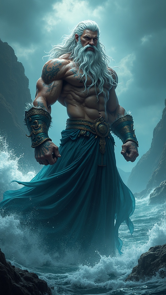 Poseidon-inspired character, infused with elements of Greek mythology and One Piece aesthetics, featuring a symmetrically powerful physique. Rendered in full body with intricate detailing, set against a dramatic oceanic backdrop. The scene is illuminated with cinematic lighting, emphasizing high contrast, capturing a dynamic and epic atmosphere, reminiscent of professional concept art on ArtStation. The visual is designed for 8K resolution, maintaining the core essence while incorporating subtle creative nuances.