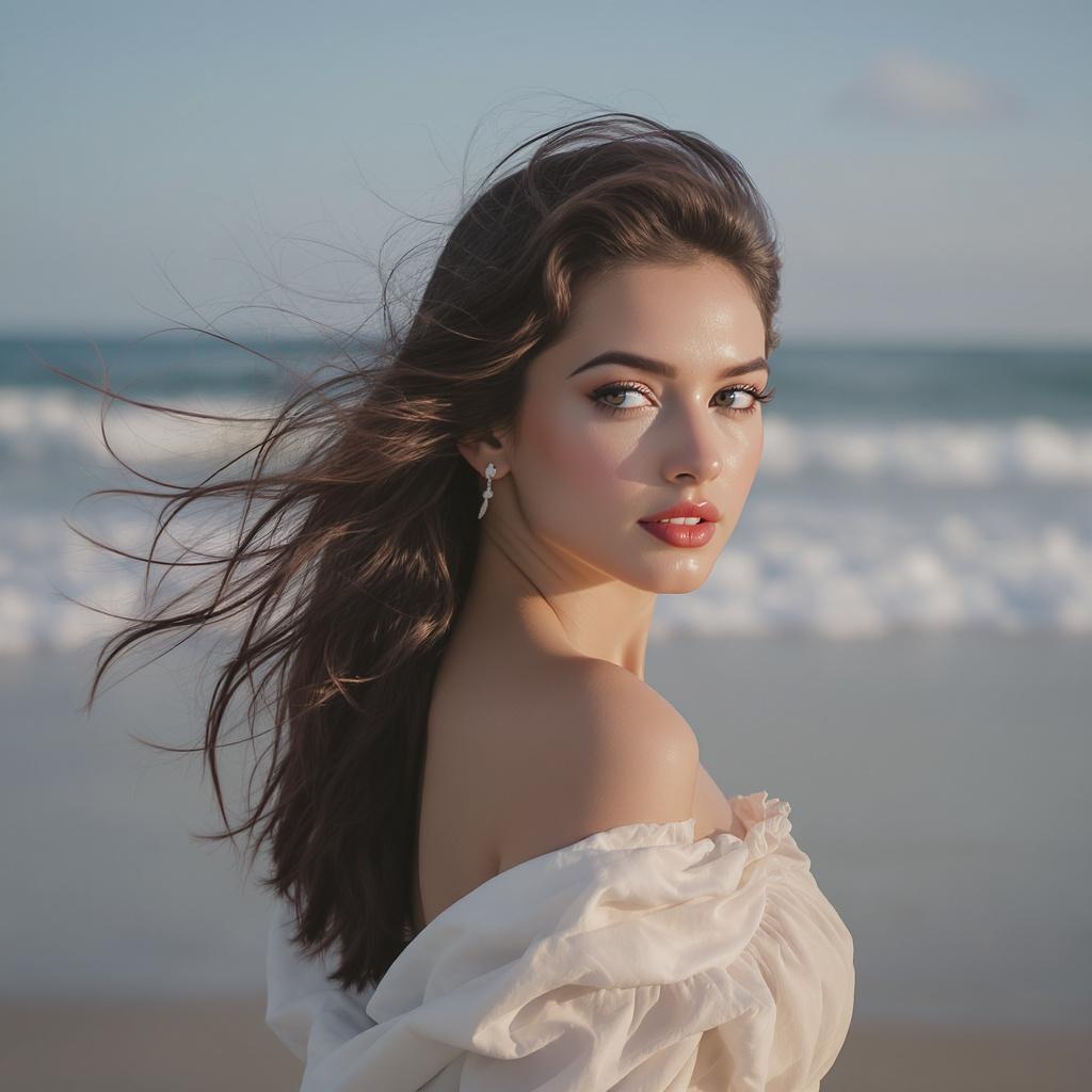 View this AI-generated image featuring professional portrait photograph of anyataylorjoy on the beach ultra realistic concept art elegant highly detailed intricate sharp focus depth of field f 1 8 85mm medium shot showcasing a serene and captivating pose soft natural lighting flowing hair catching t