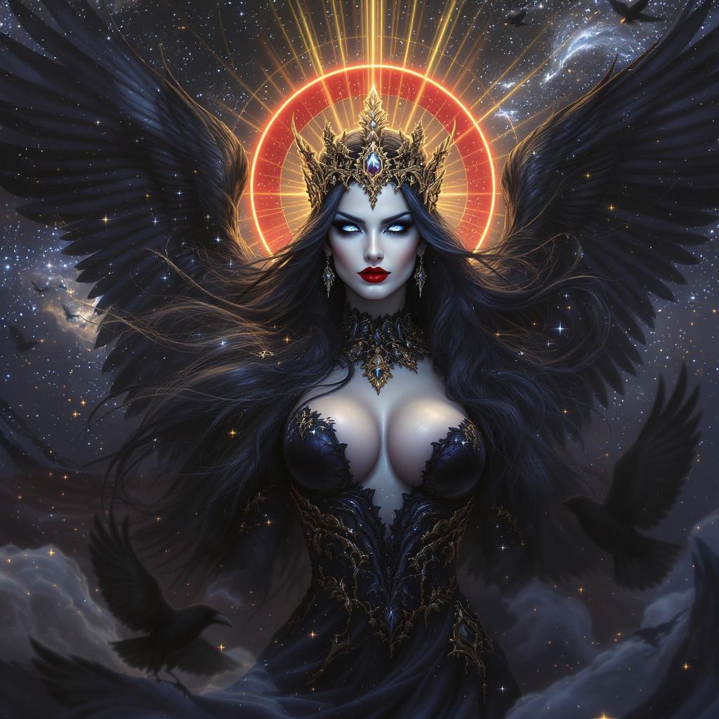 A majestic and furious queen of ravens enveloped in an opulent golden aurora, her presence both dramatic and alluring, exudes a dangerous allure. Her flowing black plumes ripple as she commands her ravens with a fierce intensity, her red lipstick accentuating her icy blue expression. Her hair, rich and black as night, frames her enigmatic face. The deep indigo of her eyes echoes Pantone 2766, capturing the essence of a World of Warcraft universe with psychedelic overtones. Clad in a sheer, silk gossamer dress that's as ethereal as a birth canal's journey, she stands against a cosmic backdrop filled with stars and galaxies. In a portrait that exudes Greg Rutkowski's artistic flair, a regal ornate crown sits upon her head, surrounded by god rays that lend a luminous aura. An iridescent red halo casts an enchanting glow, enhancing the ultra-realistic, vividly detailed environment. The macabre elements reflect a dark fantasy, combining atmospheric hyperrealism with an epic, wide-shot perspective. The scene is an intricate play of light and shadow, captured in sharp focus, resembling an octane render with a cinematic edge, depicting her as a powerful femme fatale.