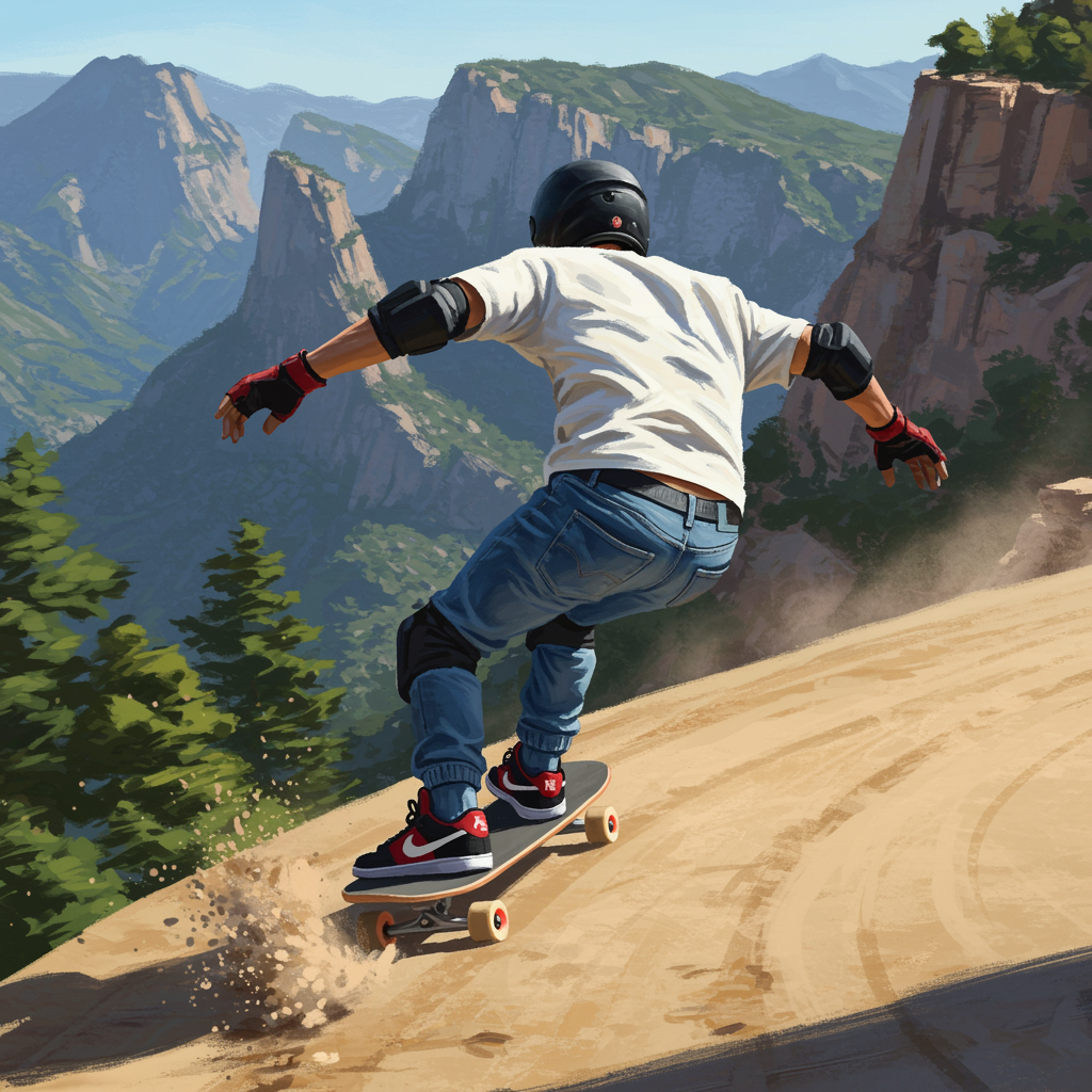 A dynamic, raw painting captures the exhilarating rush of a pro skateboarder racing down a mountainous terrain. The scene is set from behind, showcasing the skater's black helmet and loose white T-shirt billowing in the wind. He wears denim jogger pants and black knee pads for protection, complemented by vibrant red gloves and stylish Nike SB skate shoes. As he expertly maneuvers on his longboard, a trail of dust swirls around him, enhancing the sense of blistering speed. The majestic mountain backdrop features rugged canyons and lush nature, emphasizing the rider’s daring descent. The artwork exudes a professional yet wild aesthetic, emphasizing motion and adventure with a 9:16 aspect ratio, a raw style, and a high degree of stylization.