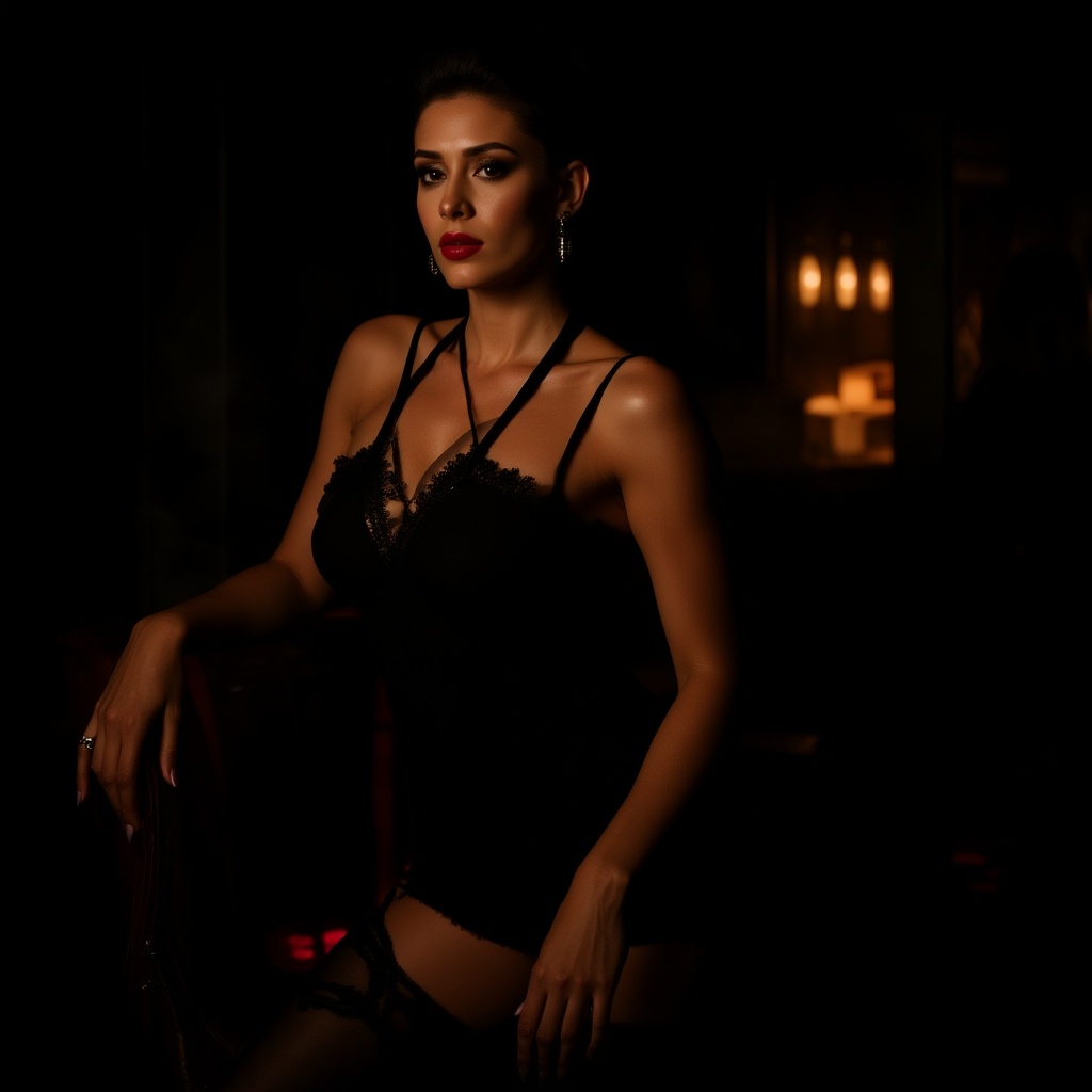 RAW photo, low key, cinematic composition, Moulin Rouge ambiance, cabaret style, featuring a beautiful young woman, slender and toned, in a burlesque club setting. The photograph captures intricate details, with a sultry and alluring pose in a smoky, darkly lit room. The image focuses on muted color tones, with striking blacks and reds. Rim lighting accentuates her form, highlighting delicate lingerie in soft cinematic light. The scene presents a dynamic pose and an intriguing angle, emphasizing photorealism in 8K UHD quality. Taken by a professional DSLR camera, settings include F1.4, 1/800s, ISO 100, ensuring sharp focus and effective depth of field. The composition follows the rule of thirds, offering a sophisticated and evocative portrayal.