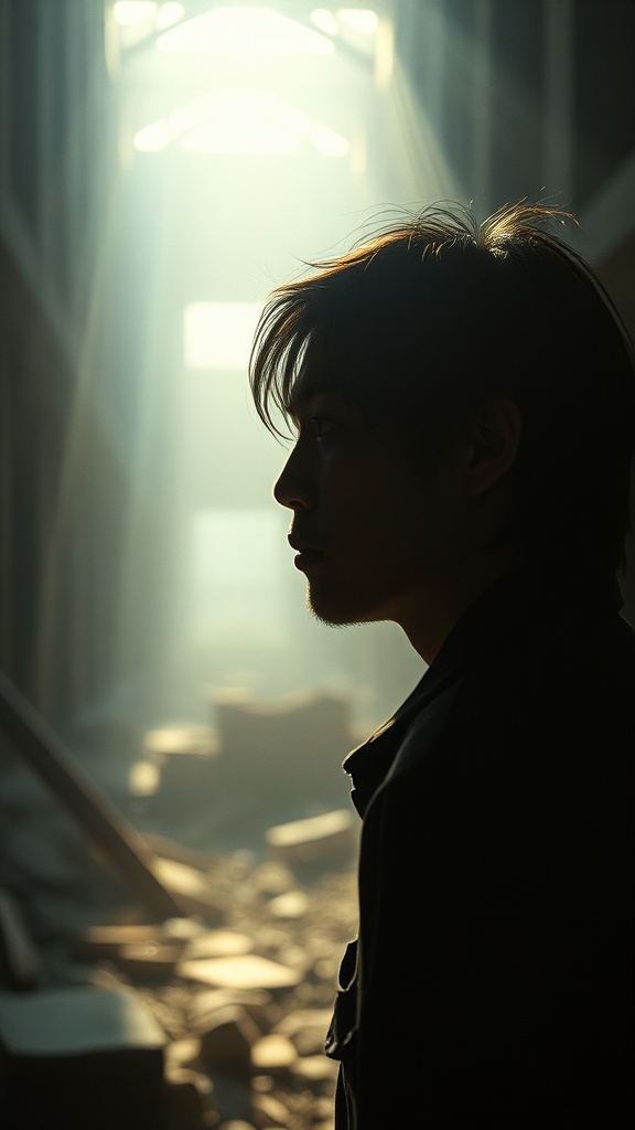 RAW photograph, 8k uhd, dslr, gentle lighting, high resolution, subtle film grain, Takeshi Kaneshiro, side profile, Leica 90mm, Kodak Portra 800, dramatic chiaroscuro lighting, f1. 4, post-apocalyptic ruins, intense, composed, cinematic 4k, richly detailed image, shot on Kodak, intricate bokeh, dramatic visual echoing The Last of Us ambiance.