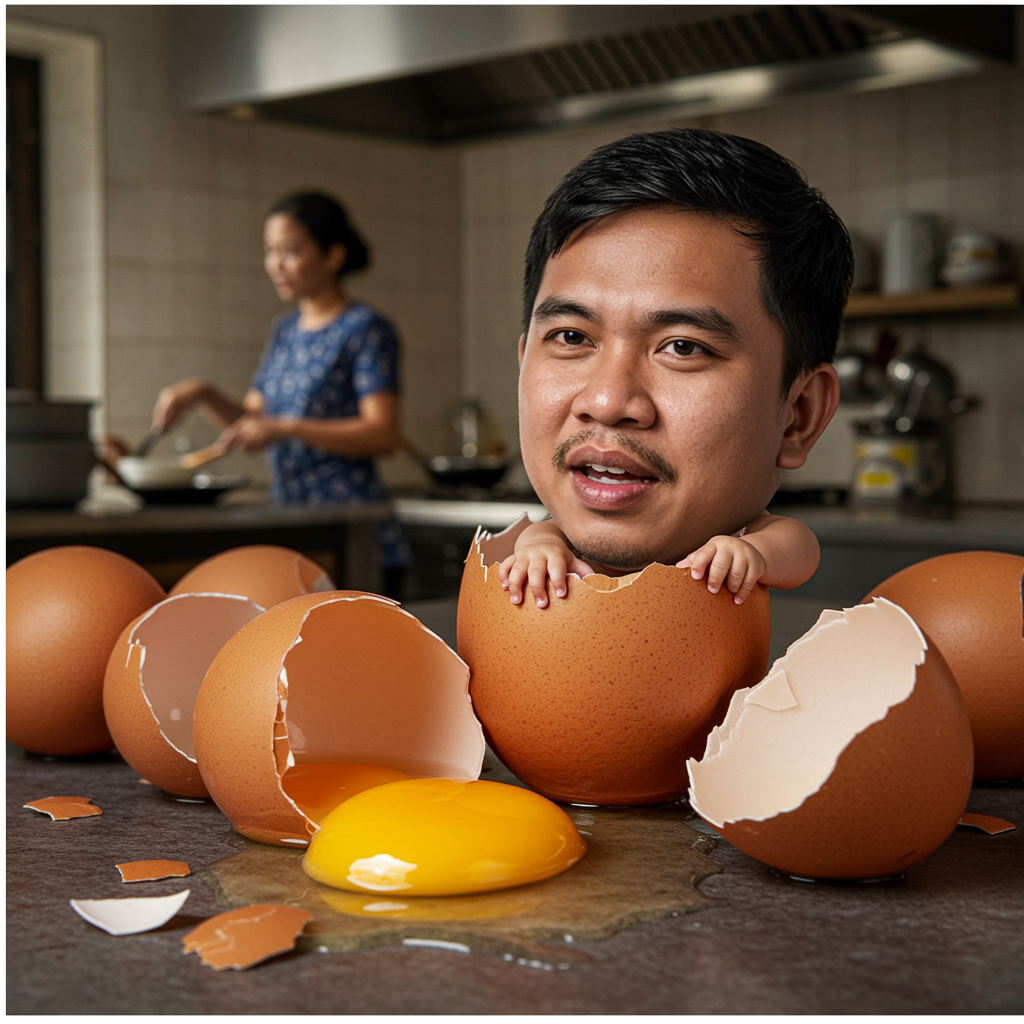View this AI-generated image featuring realistic caricature of a big headed baby with the face of an indonesian adult man emerging from a freshly cracked egg gripping the edge of the shell while nestled in the yolk surrounding this scene are several other similarly broken eggs scattered on a kitchen