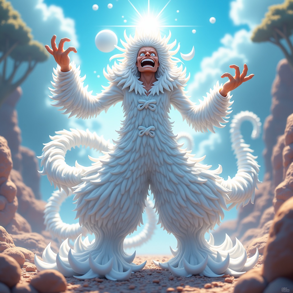 In a fantastical and vibrant realm teeming with whimsical charm, Luffy from One Piece is portrayed in his extraordinary Gear 5 transformation as the fabled God Nika. His immaculate white form glows with an ethereal brilliance, highlighting his outlandishly exaggerated elasticity, as if defying the very laws of physics. Set against a backdrop bursting with colors and playful absurdity, Luffy's rubbery limbs stretch and coil in a comically exaggerated manner, evoking laughter and awe. His facial expression is a hilarious mix of determination and mischief, perfectly embodying his adventurous spirit. The scene is a masterpiece of cutting-edge rendering techniques, capturing intricate details with unmatched artistry, while small creative twists breathe fresh life into this legendary transformation, ensuring a visual delight that resonates with the whimsical essence of Luffy's boundless imagination.