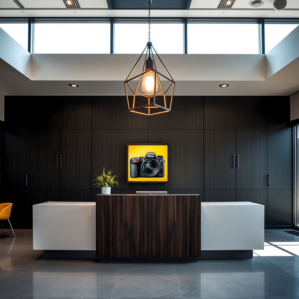 View this AI-generated image featuring a chic reception area features a minimalist desk illuminated by a stylish geometric pendant light the nikon z9 camera is artfully displayed capturing the essence of modern photography the backdrop is a sophisticated deep charcoal subtly reflecting the daylight