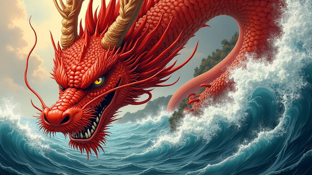 View this AI-generated image featuring red dragon amidst turbulent waves art print styled like a fusion of k ji morimoto s neo traditional japanese flair and john blanche s intricate murals blended with tyler walpole s intense close up techniques absurdist elements add a surreal twist with dragon sc