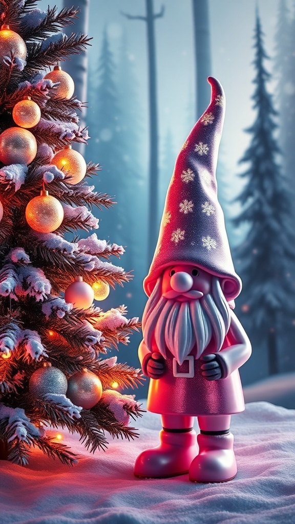 View this AI-generated image featuring a beautifully rendered cgi scene showcasing a mystical new year tree adorned with shimmering luminous decorations beside which stands a scandinavian christmas gnome redesigned in a kaws inspired style featuring bold lines and whimsical shapes the gnome s glossy