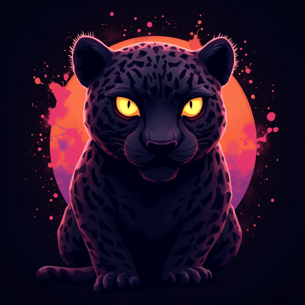A digitally rendered 3D vector art piece showcasing a silhouette design of a jaguar with sharp, defined eyes that seem to glow with the colors of a vibrant sunset. The jaguar is set against a deep black background, and its form is created with a playful, low-poly style that adds a cute and quirky charm. Surrounding the jaguar are splashes of bright, bold, watercolor-like effects in hues of pink, orange, and purple, creating a retro aesthetic that feels both modern and nostalgic. This piece is crafted with photorealistic rendering in 4K resolution using Cinema 4D, with a bird's-eye view presented in an isometric style. Soft lighting highlights the jaguar's features, focusing on its character and presence. The overall design is a captivating blend of digital painting and low-poly geometry, offering a fresh take on traditional t-shirt art.