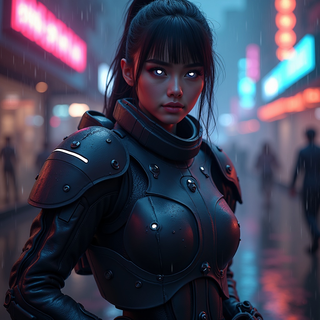 View this AI-generated image featuring a stunning 8k rendering of a beautiful young woman embodying the spirit of a goddess she wears sci fi medium armor adorned with glowing neon lights that shimmer in the urban rain soaked environment her eyes are a striking white reflecting a fierce determination