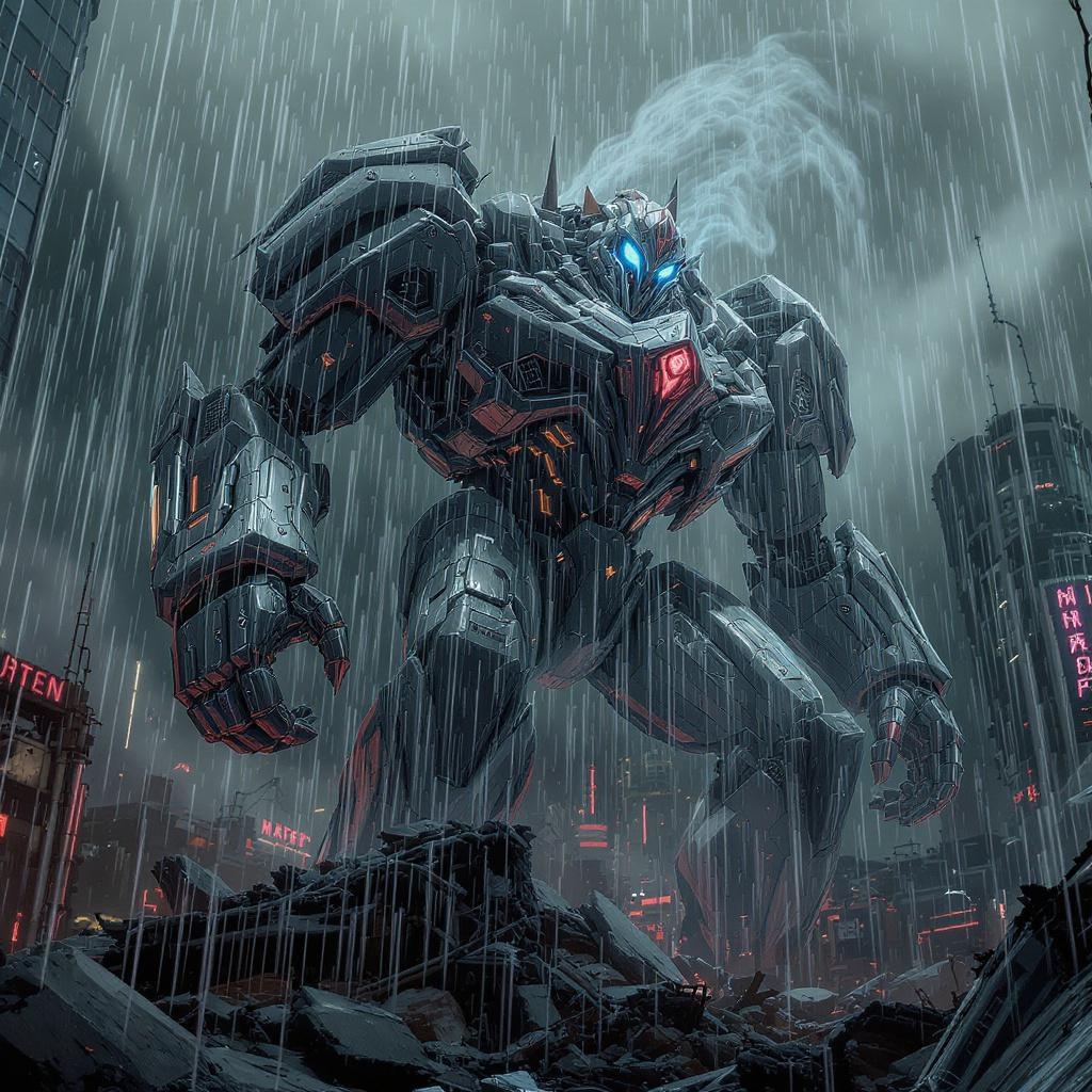 View this AI-generated image featuring a colossal robot poised on the remnants of a shattered structure its luminous eyes piercing through the darkness reminiscent of bionicle and intricate mecha designs the scene is drenched in a cyberpunk atmosphere with rain cascading down and smoke swirling arou