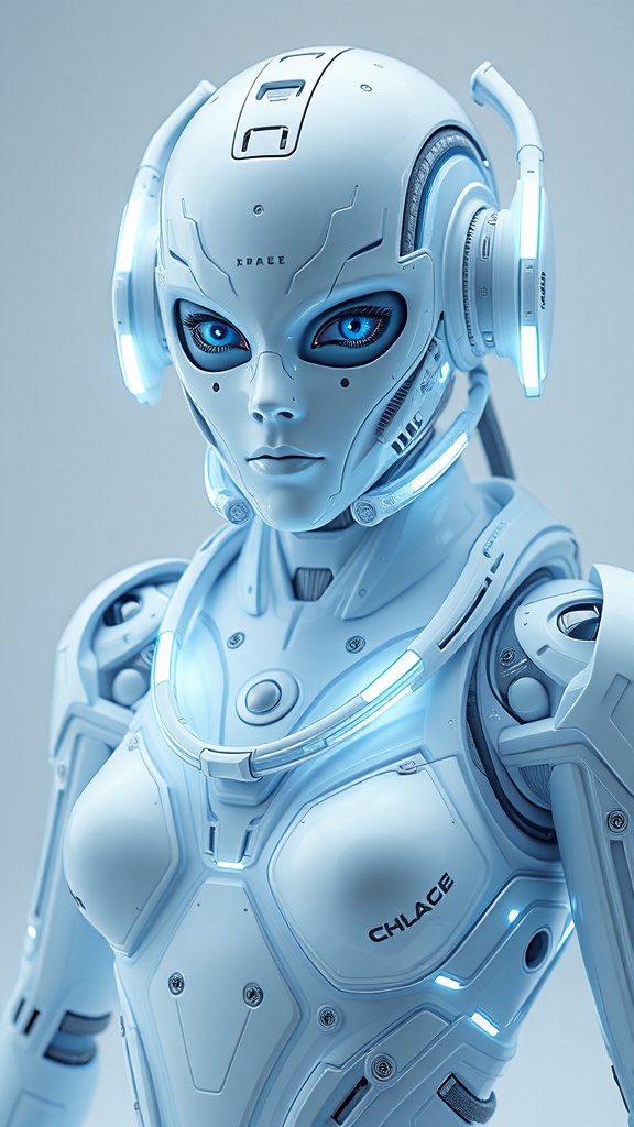 robotic visage futuristic cyborg futuristic latex space suit with transparent glowing tubes mechanical elements medium shot thigh to waist blue eyes advanced technologies hard surfaces fashion industry sharp focus high detail cinematic style white minimalist futuristic realism ultra-realistic photorealism studio lighting mechanical structures hard surfaces octane render highly detailed render 3d graphics unreal engine lighting 8k and 4k resolution glossy surface