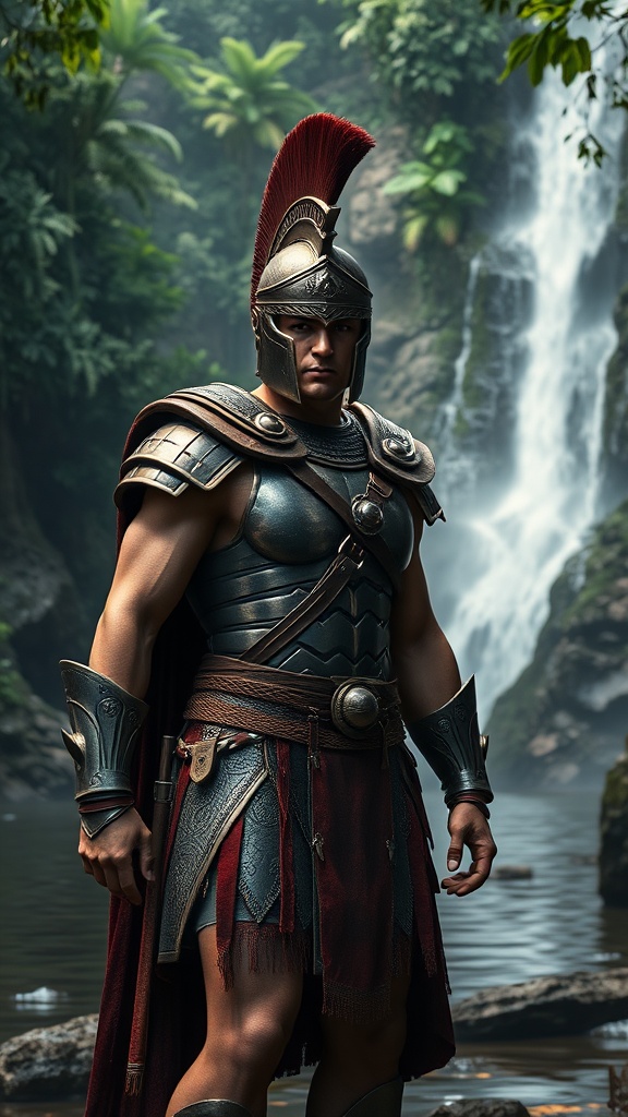 View this AI-generated image featuring roman warrior in intricate spartan inspired armor standing in the lush amazon river gorge near a cascading waterfall captured in ultra high resolution the scene exhibits realistic textures and reflections enhanced by cinematic lighting and detailed visual effec